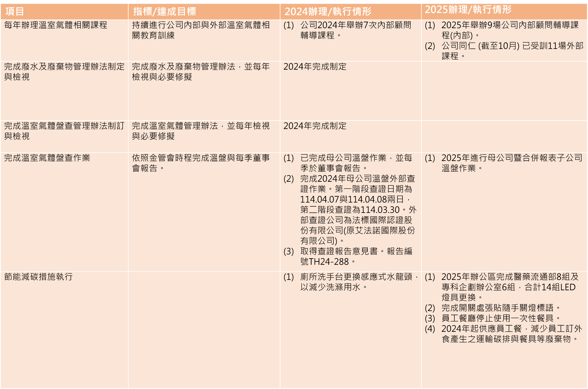 本公司自2024年起,每年執行溫室氣體盤查並出具盤查報告書,提供盤查清冊及外部查證意見書,進一步檢視環境管理作業與成效,包括能源使用評估、溫室氣體排放狀況、廢水與廢棄物管理等情況,並配合公司治理與ESG制定合宜合適與可行之改善計畫,外部查證報告書每年提報公司永續發展委員會及董事會。